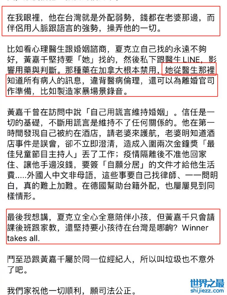 这位夏克立的好友还称,在自己眼里夏克立就是个弱势,黄嘉千用人脉和语言的强势,摆弄着夏克立的一切。