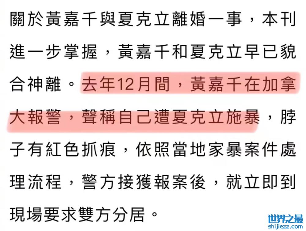 据台媒报道,黄嘉千和夏克立早已貌合神离,去年12月,黄嘉千在加拿大报警,声称自己遭夏克立施暴。