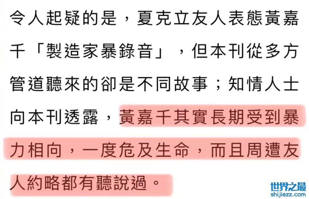 更有知情人向台媒透露,黄嘉千长期遭受到夏克立的暴力相向,严重到一度危及生命,而黄嘉千周围的好友,都有听说过此事。