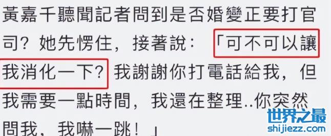 随后,黄嘉千回应这个消息,承认两人离婚,但黄嘉千却不愿意向记者透露更多的细节,她表示自己需要时间消化和整理。