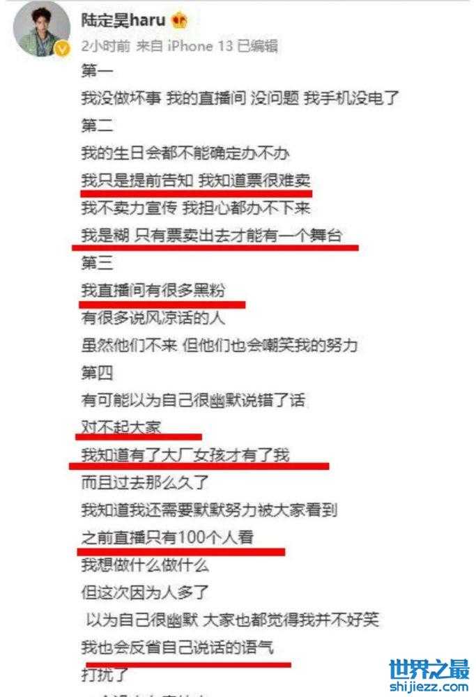 陆定昊发了一篇小作文来澄清此事,表示只是手机没电了,才会直播下线。自己也没疯,只是想和粉丝们进行友好互动。
