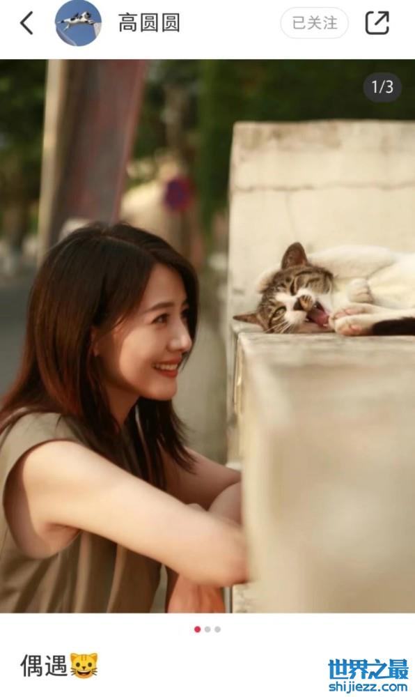 近日,女星高圆圆在自己的个人社交平台上和大家分享了一组自己偶遇小猫猫的照片,照片中的高圆圆笑容明媚,一脸温柔地和躺在高墙上的小猫猫玩耍。