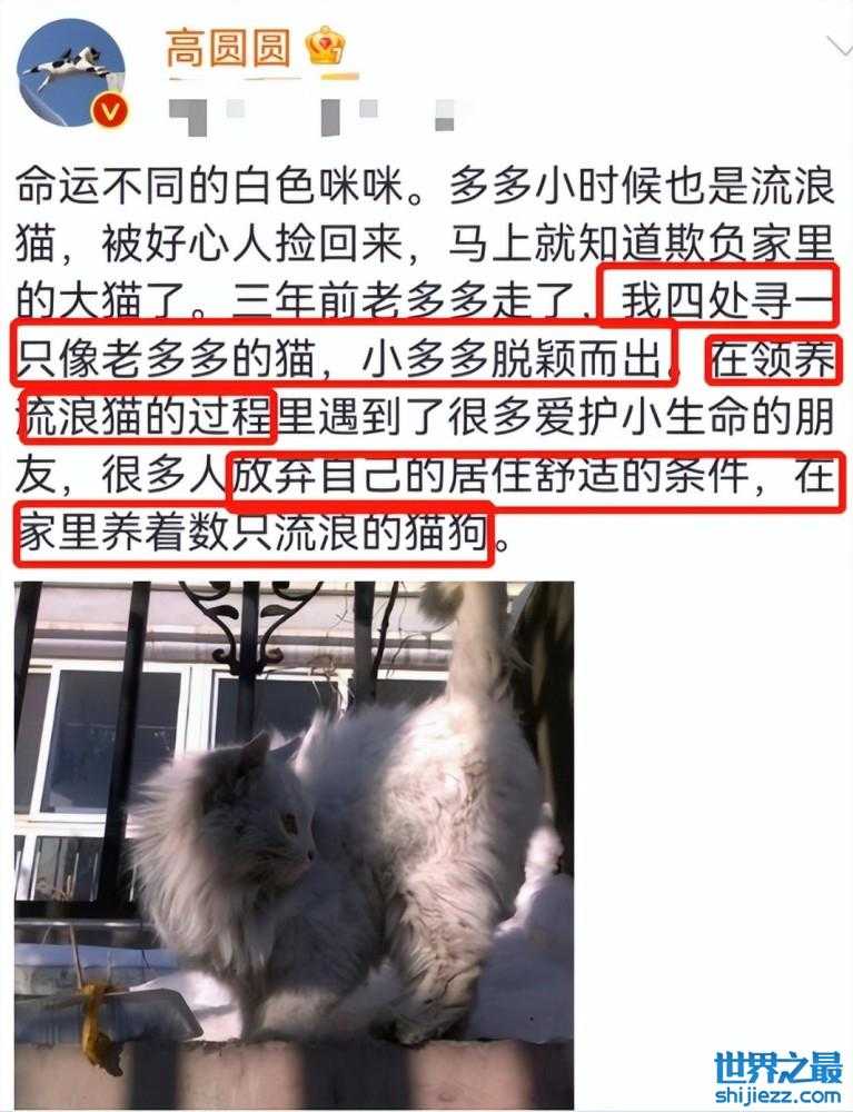 高圆圆一直热心救助各种流浪的小动物,她曾不止一次的在个人社交平台上晒出了自己救助与领养小猫猫的照片,因为自己对以前多多猫猫的想念,高圆圆一直在寻找一只相像的白色猫猫,最终流浪的小多多被高圆圆领养,高圆圆还特意称赞了那些放弃舒适条件而领养流浪毛毛的爱心人士。