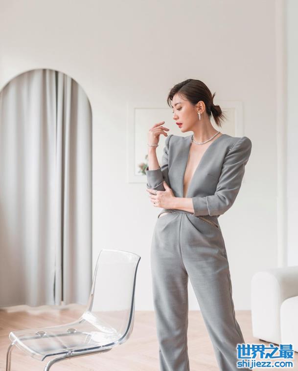 照片中,贾静雯身穿一套特立独行的灰色深V西装,肩膀处高高翘起,衣领敞开到肚脐眼的位置,上衣与裤子之间通过钮扣连接,成为样式造型成为上下一体的个性西装,衬托得贾静雯也格外性感出挑。