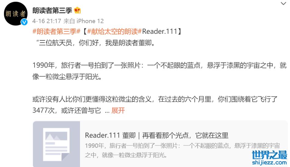 而《朗读者》第三季的官方账号最后一条关于董卿的动态更新还要追溯到4月16日,那也是董卿截止到目前最后一次露面献声,当时的她为三位在太空执行工作的航天员送上一段特别的朗读内容作为礼物。
