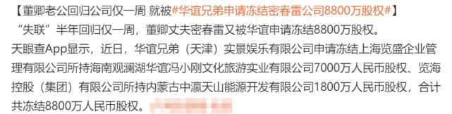 神秘消失足足半年之后,董卿老公密春雷终于爆出动向,一时之间打破了广大网友对其去向的各种猜疑,然而密春雷回归之后仅仅一周的时间,相关资料却显示,华谊兄弟公司申请冻结了密春雷公司8800万股权。