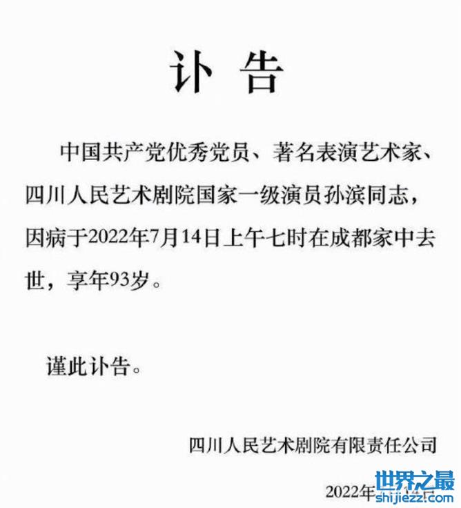 近日四川人民艺术剧院发布一则讣告,宣告国家一级演员,四川人艺艺术家孙滨同志因病在成都家中去世,享年93岁。