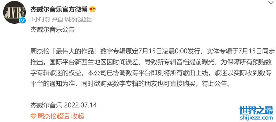 在此情况下,周杰伦所在的杰威尔公司为了保护歌迷权益宣布新专辑提前上线,于14日21点30分上线,不少粉丝表示,这样一来大家就不必为了苦等新专而熬夜,毕竟从预售那天起,广大歌迷都迫不及待希望自己能先听为快。