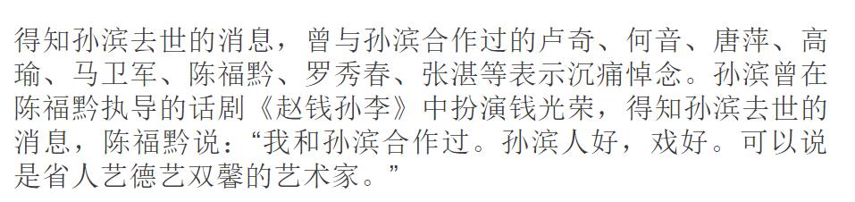 据四川人艺原院长李亭透露,孙滨老师是在睡梦中离开人间的,走得十分安详,可以说孙滨老师为演艺事业操劳一生,如今也算一定意义上的寿终正寝了。