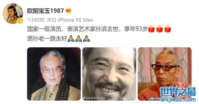 曾在电视剧《红楼梦》中饰演“贾宝玉”的演员欧阳奋强也特意发布动态缅怀孙滨老师,希望孙老可以一路走好。