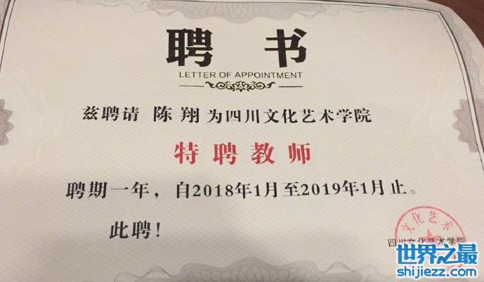 陈翔回母校四川艺术学院当了老师,并开心地晒出了任职聘书,他还将在与母校签订的合约期内不定期到学校授课。