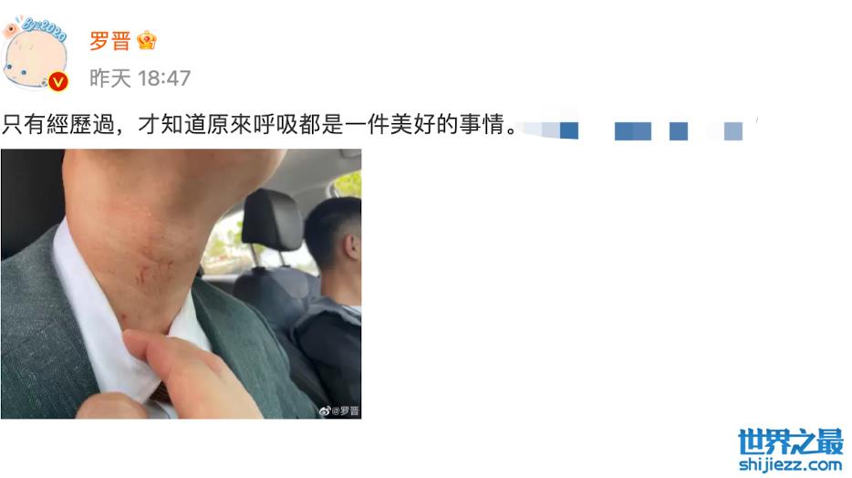 事后罗晋也在社交平台上面发布一张照片,配文说“只有经历过,才知道原来呼吸都是一件美好的事情”,照片中罗晋露出自己的脖子,上面已经被勒出了一道道伤痕,红痕遍布,脖子上还有一滴汗珠,可见当时情况的激烈。