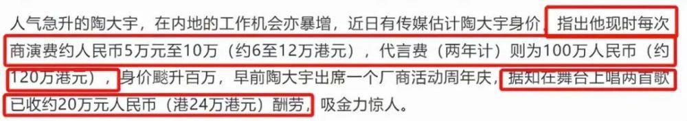 在内地人气暴涨之后,陶大宇商演的演出费在5万到10万之间,代言费两年高达百万。