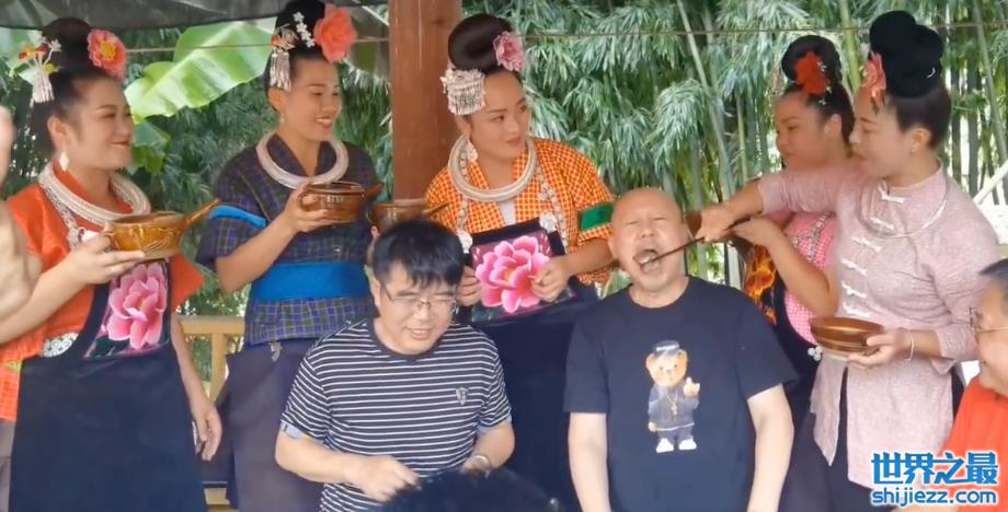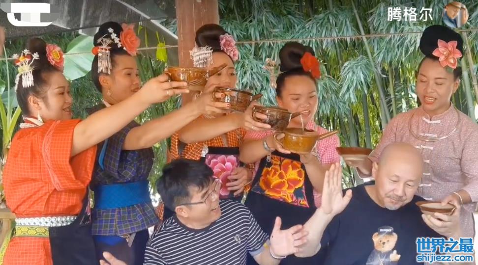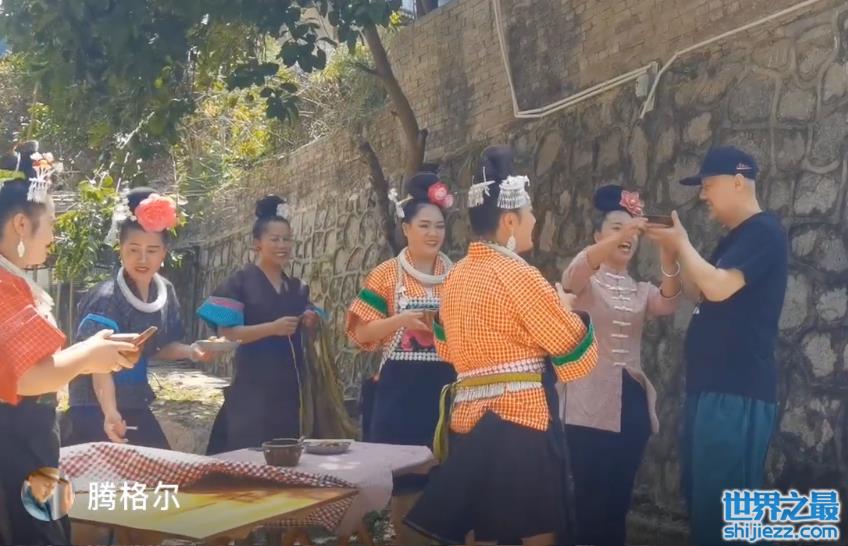 只见腾格尔已经喝不下了,连连摆手,旁边他的友人也是无情嘲笑看热闹。这群苗家姑娘们边给腾格尔喂酒,一边嘴里唱着劝酒歌,“苗家姑娘来敬酒,一杯又一杯”,边唱边跳给腾格尔弄的都招架不住了。