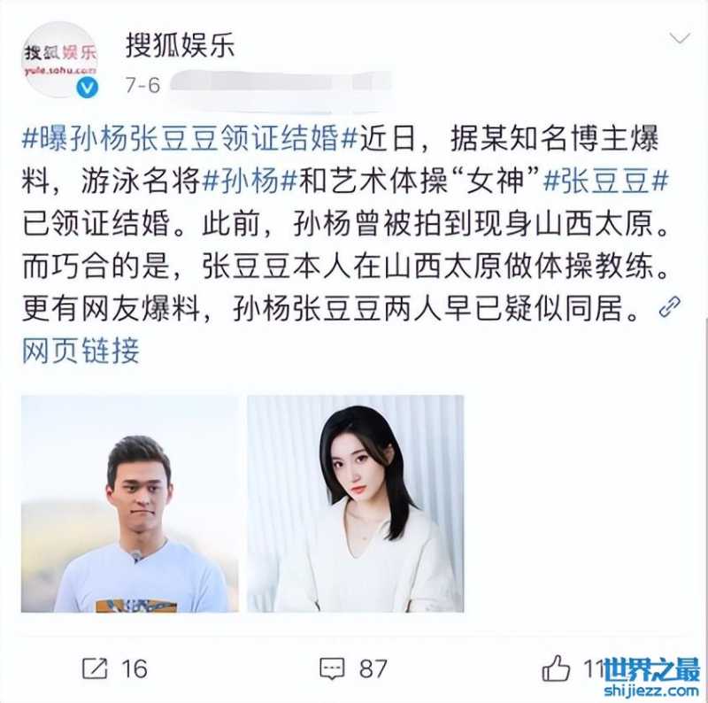 不久前就有人爆料孙杨和张豆豆已经秘密领证结婚,甚至有网友爆料在张豆豆的老家太原,多次偶遇过孙杨和张豆豆在一起逛街。目前张豆豆一直在太原工作,家庭住址也在太原,而孙杨屡次被网友爆料现身太原,似乎也印证了他与张豆豆的已婚传闻。