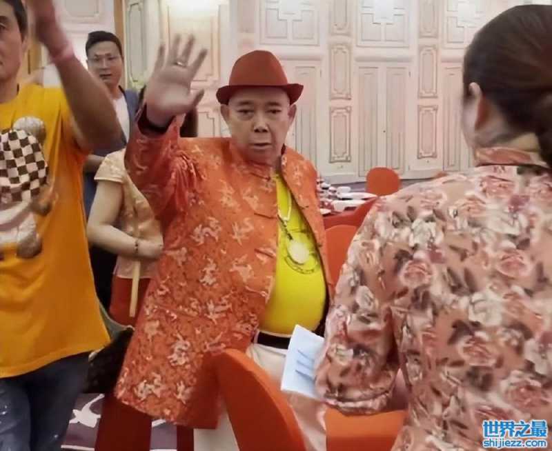 视频中,黄一飞身穿一件红色唐装,头戴酒红色礼帽,下身穿着一条白色长裤,脚踩白色小皮鞋,一身派头十分隆重且喜庆。只见黄一飞在一位年轻人的搀扶下,大踏步地向前走去,大肚腩十分突出,显得虎气腾腾,派头十足。