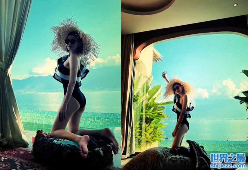 拍照一向会凹造型的李彩桦,穿着泳衣跪在坐垫上展示着自己的身材。紧身的泳衣将她完美的身材曲线勾勒了出来。一双细长腿展露无遗,好身材令人十分羡慕。她所在的房间装修豪华,外面就是湖泊风景非常好。李彩桦手撑着玻璃,融入了身后的美景之中。