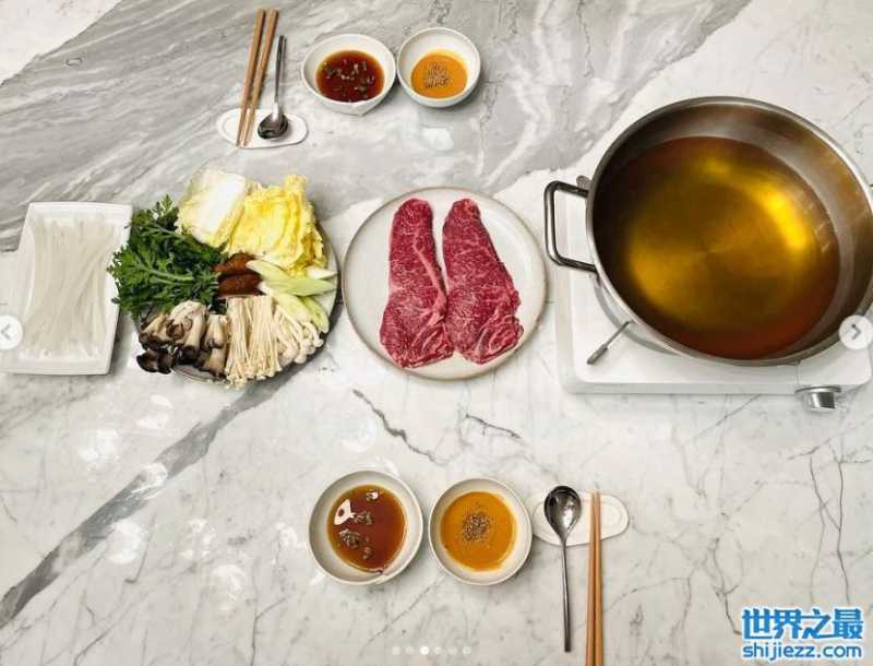 另外有网友猜测上面估计是他们夫妻晚上的美食火锅,两块大的牛肉和一盆子的香菇青菜,还配了一小盘的红薯粉丝。