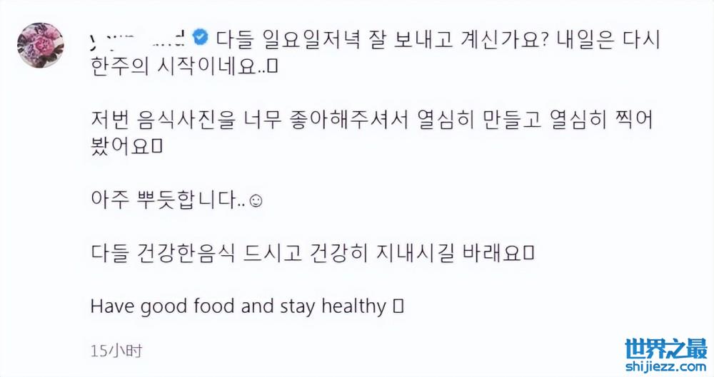 孙艺珍发文大意:大家周日晚上过得好吗?明天又是一周的开始…因为你(指玄彬)太喜欢上次的食物照片了,所以我努力做了,努力拍了。