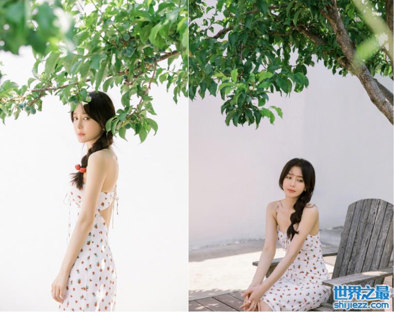 由于樱桃长裙后背独特的绑带设计,秦岚的光洁美背被一览无余地展现出来,盈盈一握的腰肢在裙子的映衬下也更甚了,绿树成荫,梅子挂树,老旧木凳,少女的出现给整个画面增添了一抹亮丽的色彩。