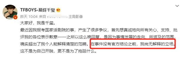 在国家话剧院发出声明后不久,易烊千玺就发长文回应了考编事情,解释了自己为什么这么长时间内不发声。