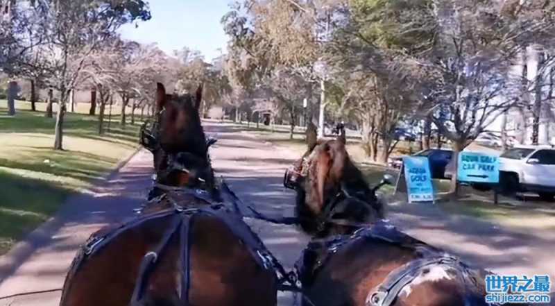 只见镜头一转,原来田震正坐在马车上面,由两匹皮毛油亮的马儿拉着赶往村庄,真的十分惬意。赶车的人应该是田震的丈夫张卫宁,从田震看着他嘴角露出的甜蜜笑容就可见一斑。