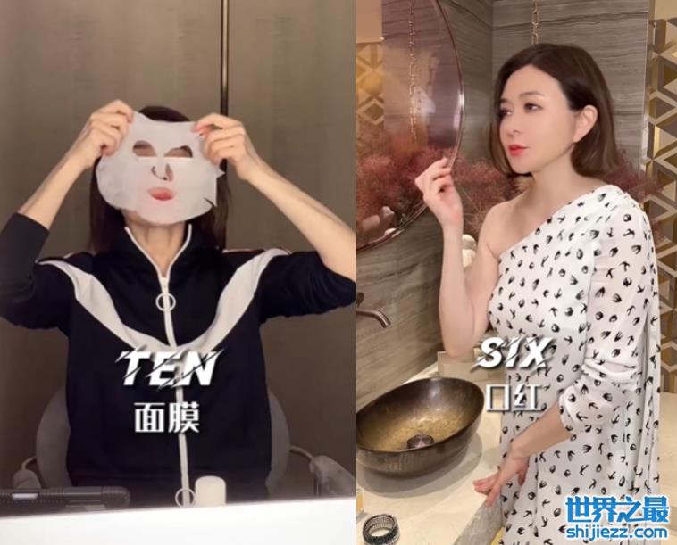 在视频的开始,只见关之琳首先是穿着黑色的运动装全素颜出镜,之后经历了敷面膜、擦粉底、涂口红、选衣服等十个步骤,最终成就了画面最后精致的都市丽人形象。