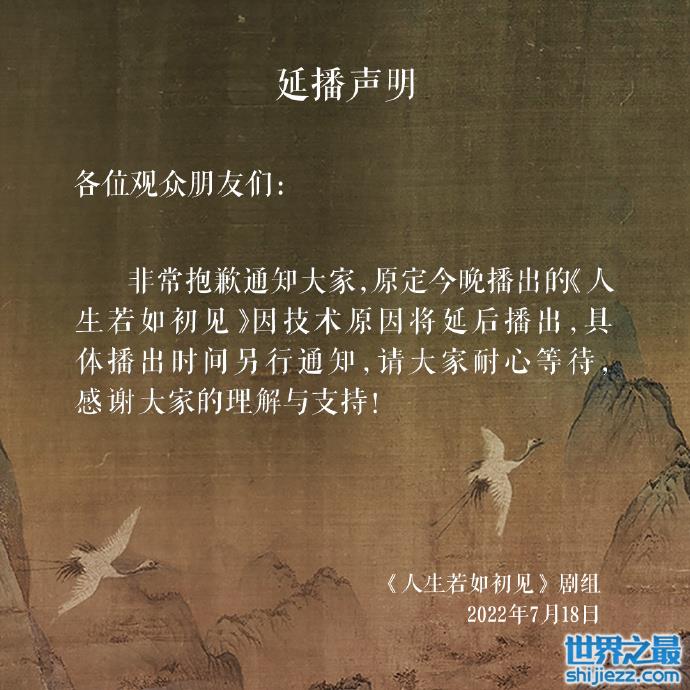 7月18日,原定正式上线的电视剧《人生若是初见》突遭变故,有网友发现该剧在开播前未能如期上架,而后又不动声色的上架,然而正当观众准备开追此剧之际,这部剧又猝不及防地被下架,而官方给出的回应是因技术原因延后播出,希望大家能够理解。