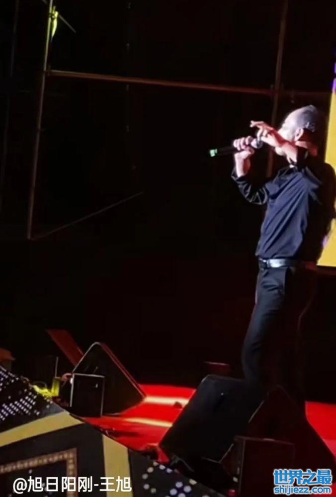 随后,王旭站在台上热情唱歌,边唱边挥手,十分卖力。有时情绪到了,他还拿着话筒对着台下观众,企图让他们互动,一起来唱。