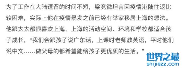 不过现如今梁烈唯的妻儿仍在香港定居,梁烈唯也表示自己有移居上海的想法,希望给孩子更优质的生活。看来等以后梁烈唯赚够了钱,很有可能会在上海买房定居。