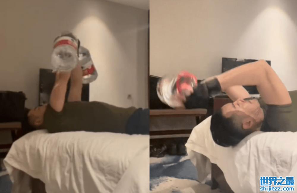 在隔离的时候海一天也不会忘记健身,善于利用身边的工具去健身。在房间内,海一天拿着两大桶矿泉水作为健身器材,躺在床上练起了手臂。他一手拿着一桶水往上托举,咬紧牙关的他,表情很认真。不得不说,海一天真的很自律。