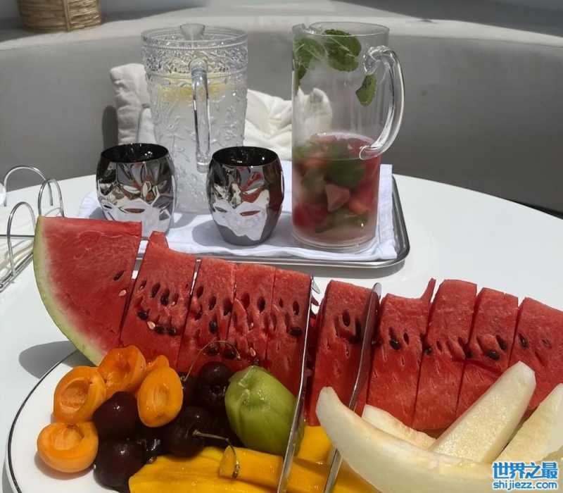 大女儿娜塔丽娅还分享在奢华游艇上面的水果拼盘,有西瓜和其他的水果。看来娜塔丽娅是不喝酒的,上面摆着饮料不是红酒,她虽然已经满了18岁,对自己的要求还是挺严格的。