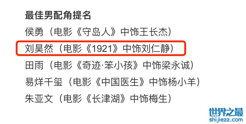最佳男配除了有易烊千玺外,还有实力派侯勇、田雨、朱亚文加入角逐,刘昊然凭借《1921》里的刘仁静一角成功入围。