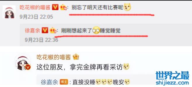在比赛期间,王冰冰与徐嘉余也经常互动留言,王冰冰提醒徐嘉余不要忘记还要比赛,还要他拿完金牌再看采访,每次留言徐嘉余都会回复,还互道晚安。两人还互相关心工作情况,聊天的内容比较随意自然。