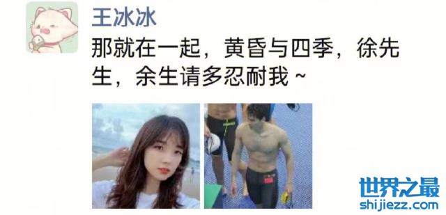 7月20日,有网友爆料一张朋友圈的截图,疑似央视记者王冰冰与游泳运动员徐嘉余官宣恋情,配文写道“那就在一起,黄昏与四季,徐先生,余生请多忍耐我。”