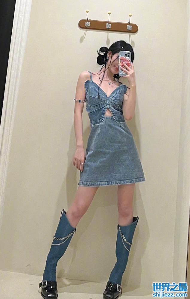 这张照片中鞠婧祎拍了全身照,露出一双又直又细的大长腿,脚上穿的长筒靴甚至还有一些宽大,显得鞠婧祎整个身体更加瘦小。