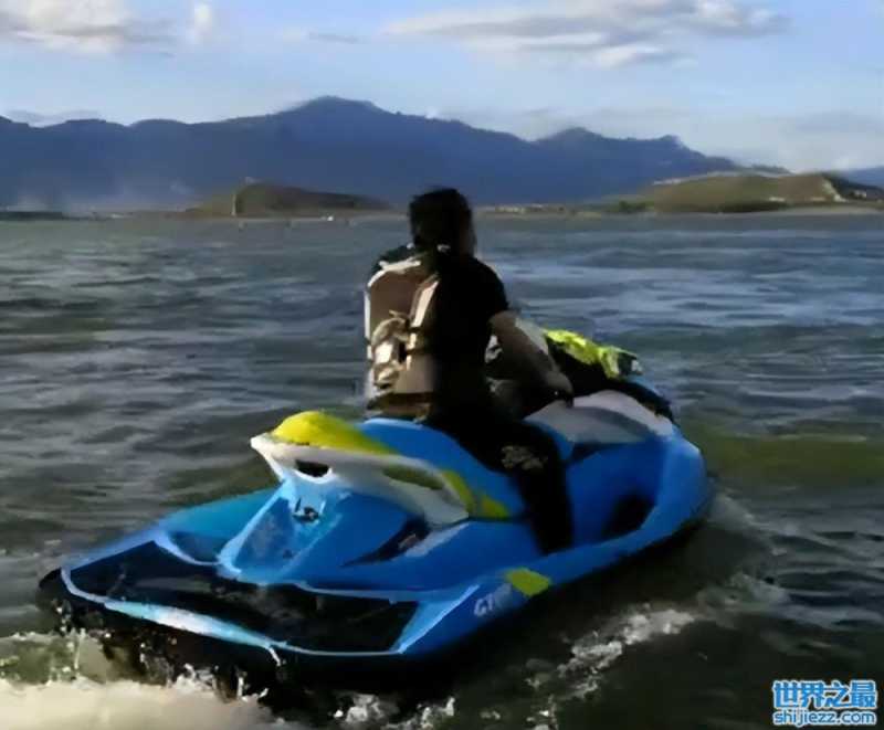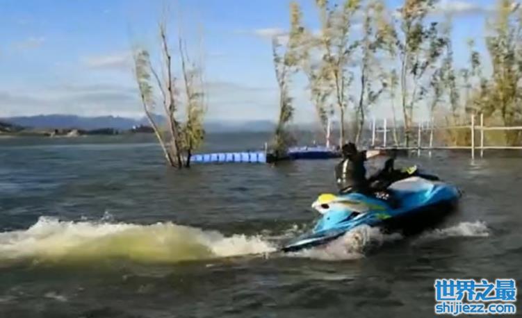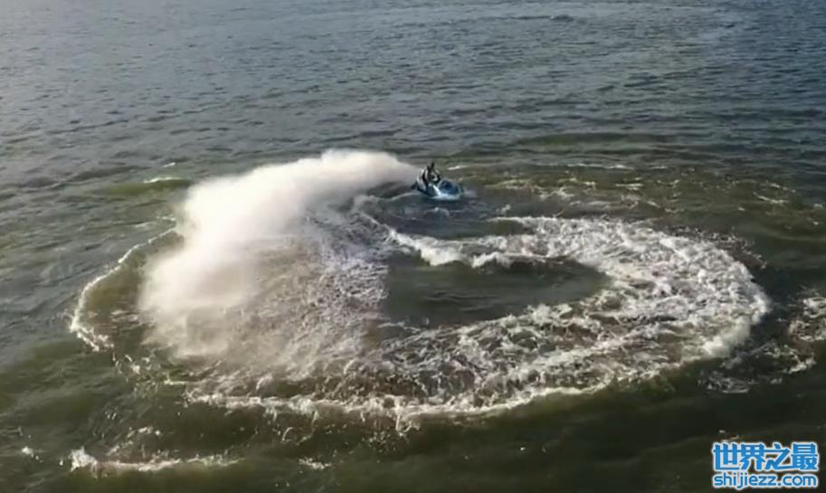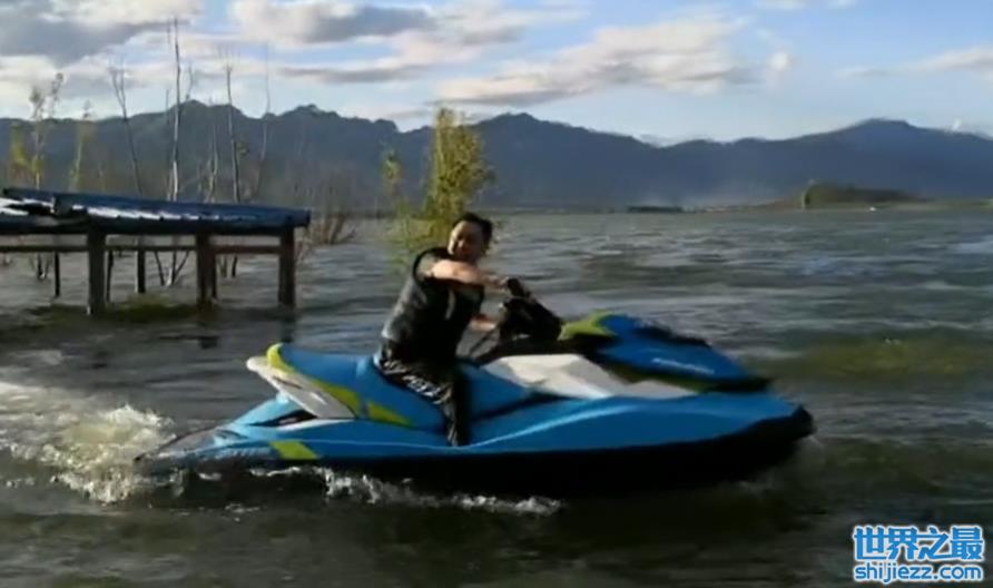 于谦在骑摩托艇前没有过多的前奏准备,只有几秒后于谦便直逼大湖的中央,它像一条刚刚获得自由的鱼儿一般在湖中放肆的驰骋,不断地通过绕圆圈这种高难度、需要急速漂移的动作来展示着自己高超的技术。