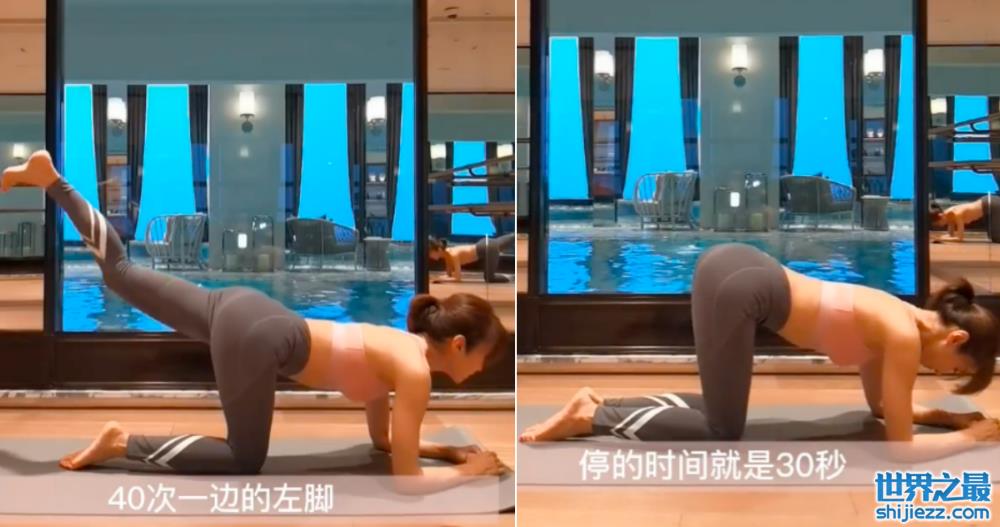 接着黎姿又演示起了这一套动作,她趴在瑜伽垫上面,胳膊撑在地上,两条腿跪着,然后开始蹬腿,交叉左右脚。在这个过程中可以清晰看出黎姿的腰肢纤细、臀部丰满,身材就像20岁的少女一样纤细苗条。