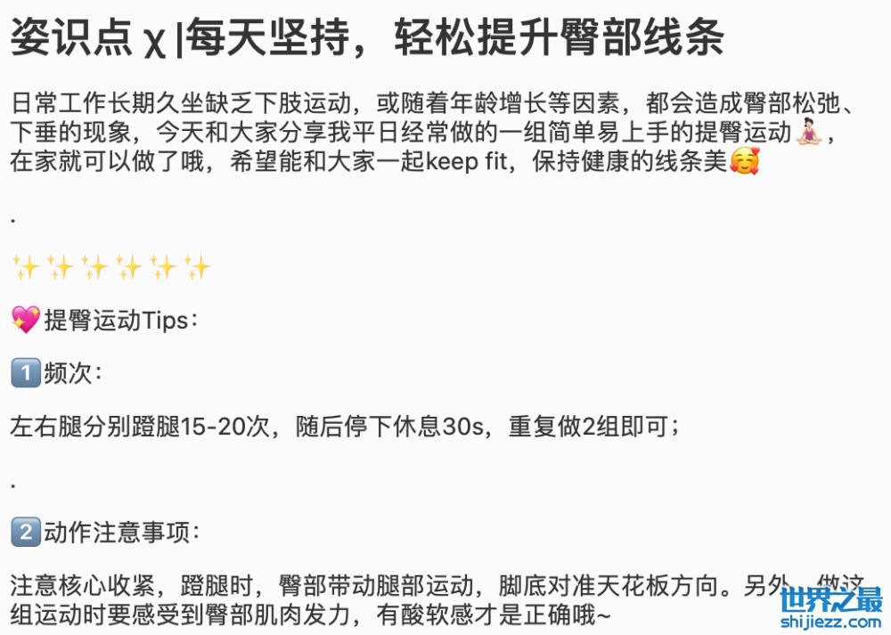 黎姿晒出的这个视频的同时还写了一段长文内容是提升臀部线条的锻炼秘诀。那就是每天坚持提臀运动,并给大家分享了提臀运动的小tips。
