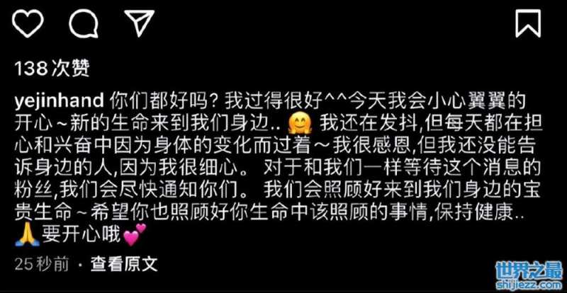 当时她是这样子说的:对于和我们一样等待这个消息的粉丝,我们会尽快地通知你们的。我们会照顾好来到我们身边的宝贵生命,希望你们也照顾好你们生命之中该照顾的事,保持健康,要开心哦。
