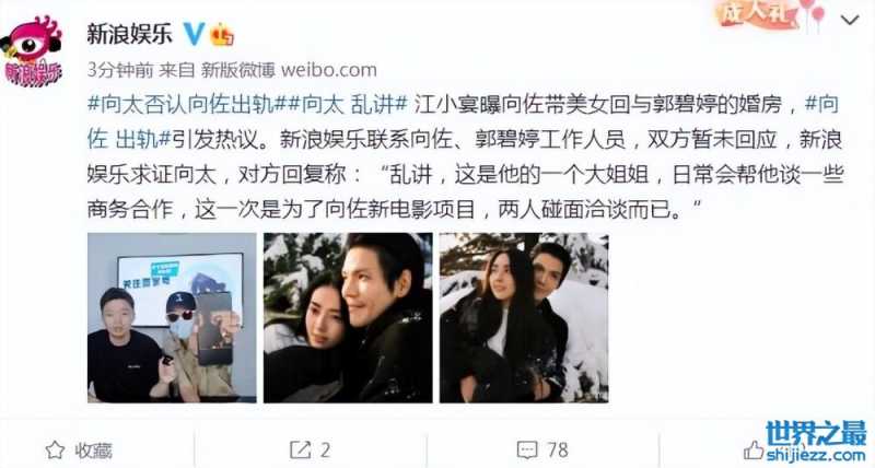 向太第一时间替儿子给出回应,并且表示自己是知情的。向佐称媒体在乱讲,那一位被拍摄到的女人是向佐日常的一个姐姐,是帮他谈一些商务上的合作事项,并不是所谓的出轨对象。