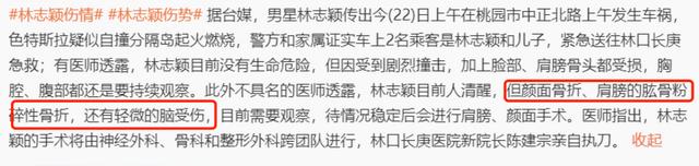 根据最新消息,有医师透露林志颖现在颜面骨折,肩膀粉碎性骨折,还有轻微的脑震荡,目前正在观察中,实在是太可怕了,希望林志颖能够早日康复。
