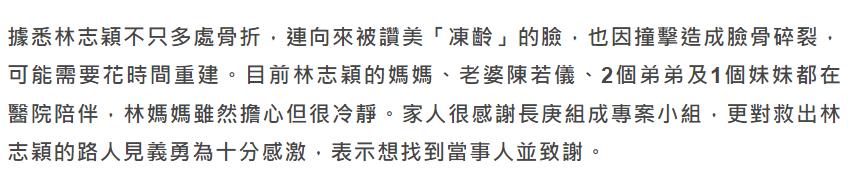 目前,林志颖的妈妈、老婆陈若仪、2个弟弟及1个妹妹都在医院陪伴,林妈妈虽然担心儿子和孙子但一直很冷静,家人也很感谢,更对救出林志颖的路人见义勇为十分感激,想找到当事人致谢。