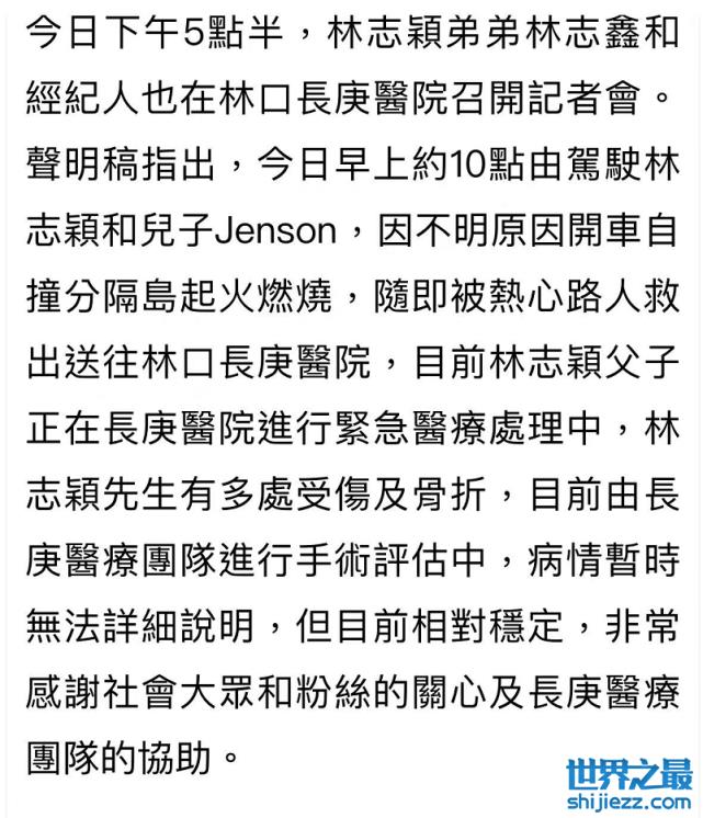 下午17点30分,林志颖的经纪人就受伤情况召开记者会,声明稿指出,林志颖及儿子因不明原因开车自撞起火燃烧,随即被热心路人救出送往医院,目前林志颖父子正在紧急医疗处理中,病情暂时无法详细说明,但目前相对稳定,非常感谢社会及广大粉丝的关心,接下俩两三天是关键期,目前尚无手术。