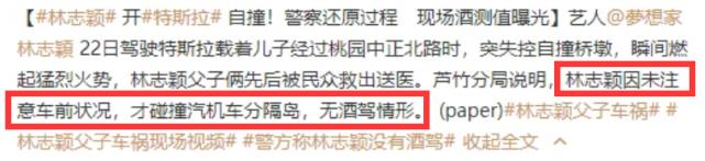 7月22日上午,艺人林志颖去在比赛的途中发生严重车祸,在行驶过程中突然向右偏移,最终不幸撞向路边桥墩上,由于冲击力度大导致车身起火,现场火势很凶猛,整个车子被烧的只能骨架,而车上除了林志颖外,还有小儿子Jenson,万幸的是孩子只有皮外伤,不过也因为年龄小,当场被吓到,父子俩随后被送到医院救治。