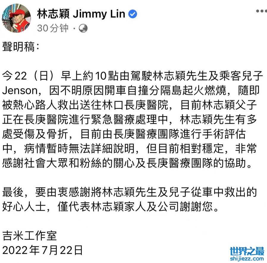 而后,林志颖的家人登录账号发布声明稿,透露病情暂时无法说明,手术还在进行评估中,最后感谢将林志颖先生及儿子从车中救出的好心人士,仅代表林志颖家人及公司谢谢您。