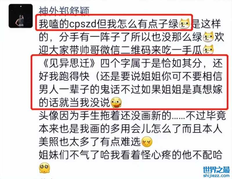 而在王冰冰徐嘉余恋情绯闻曝光时,还有网友曝光了当时疑似是徐嘉余前女友郑舒颖的朋友圈截图,说自己头上有点绿,并且告诫王冰冰不要相信徐嘉余的鬼话,暗示徐嘉余在跟自己在一起的时候出轨王冰冰。