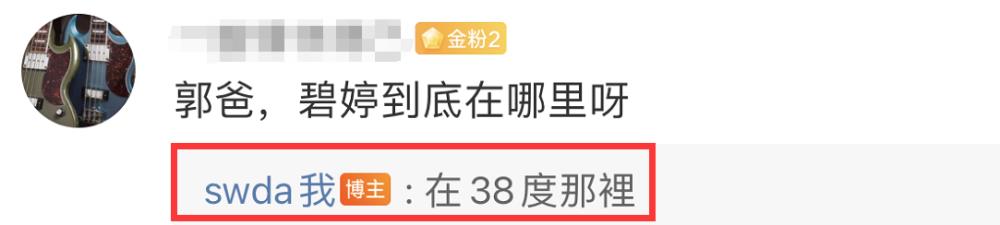 好多网友关心郭碧婷的情况,问郭爸爸碧婷到底在哪里,郭爸爸幽默回应说“在38度那里”,而后网友又问他台北的天气,郭爸爸说38度有的地方到40度,这也就告知粉丝郭碧婷目前在娘家,粉丝得知郭碧婷目前在娘家也比较放心了一些。