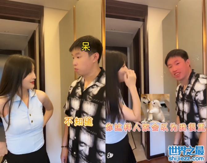 在视频的中,只见二人先是看了一遍挑战内容,看完后老婆问烧饼真的能这样吗,烧饼倒吸一口两气后,底气不足地回答着不知道,随后二人开始了挑战,只见烧饼费力地举着老婆,在这个过程中满脸都涨红了,试了几次都没有挑战成功,老婆还嗔怪他说:“你这样人家会以为我很重的”。