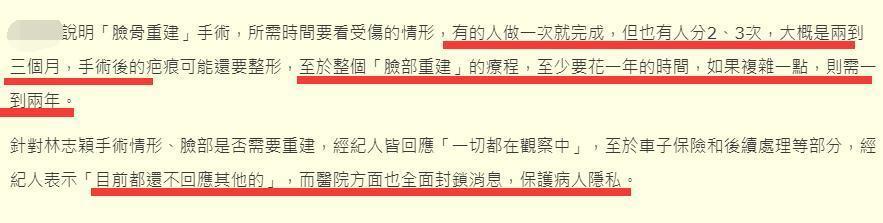 台媒曝林志颖脸骨碎裂或需重建,权威医生执刀至少治疗1年